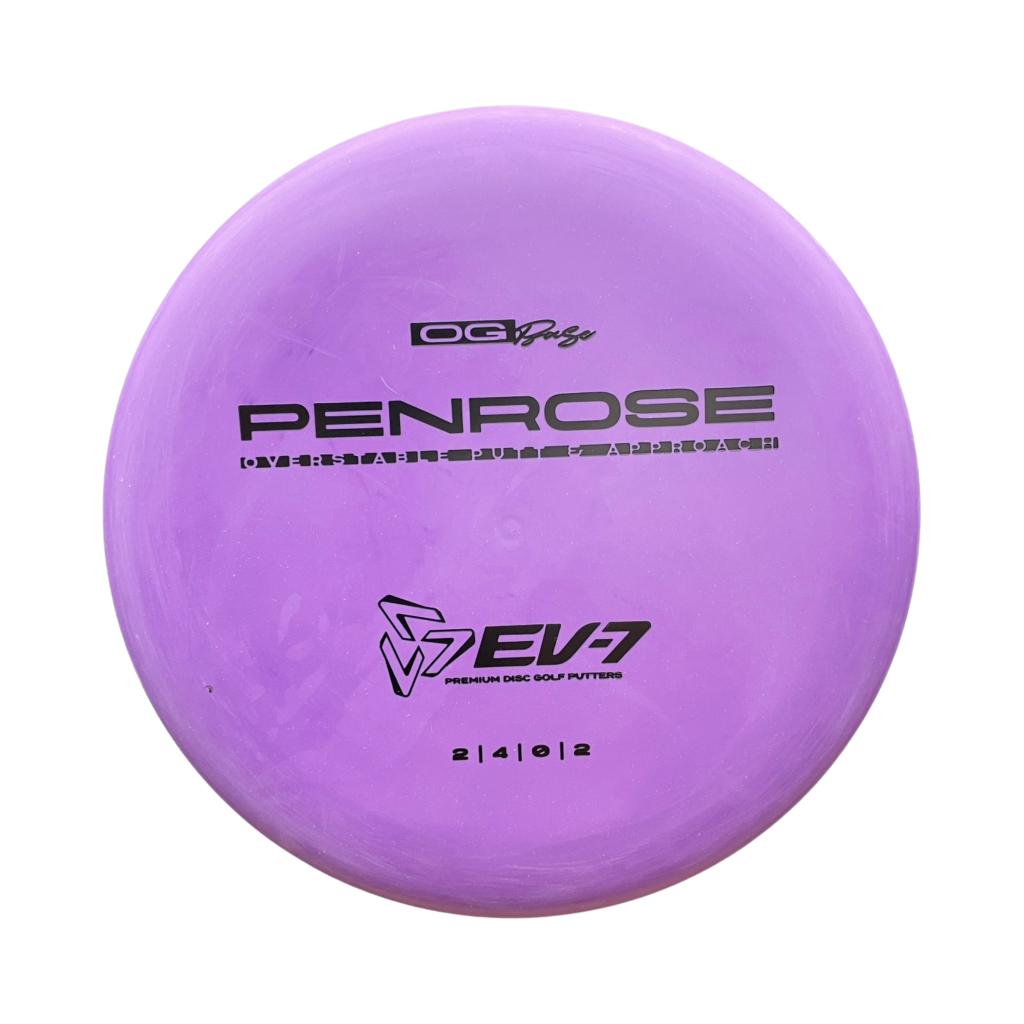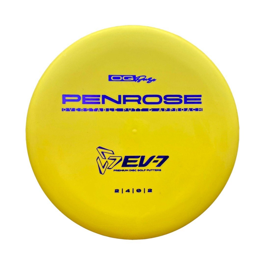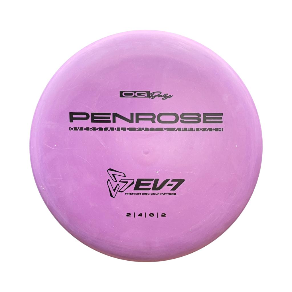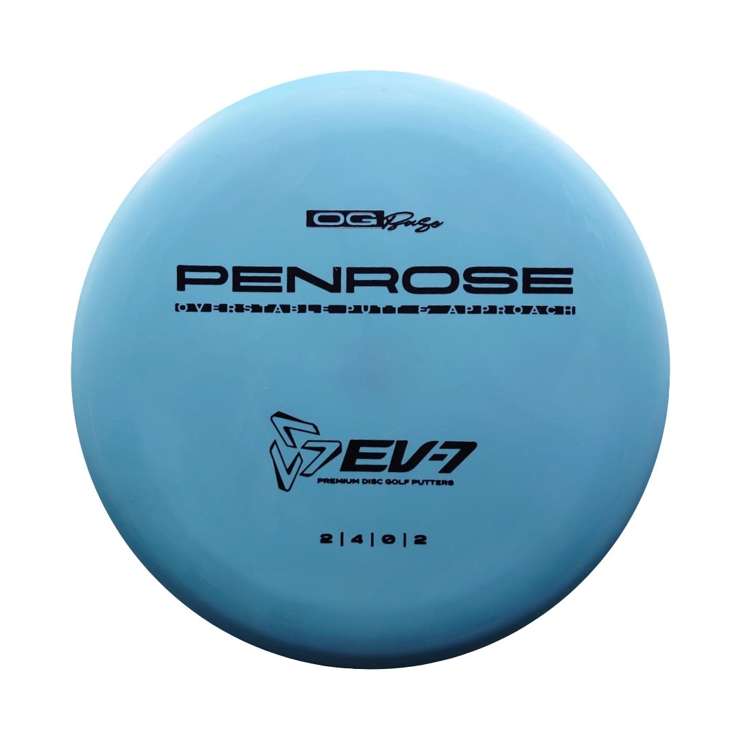 The Penrose is EV-7's debut putt and approach disc. It has reliable high-speed over stability and resistance to turn, but is uniquely straight with consistent fade at lower speeds on the putting green. With a slightly deeper profile, small bead, and smooth feel, the Penrose fits the hand comfortably, inspiring confidence for both putts and upshots.