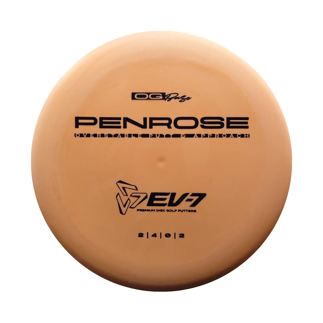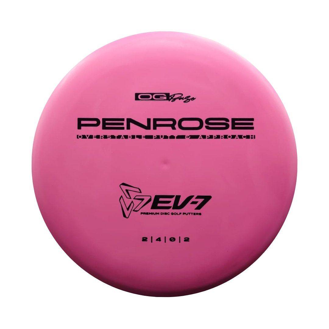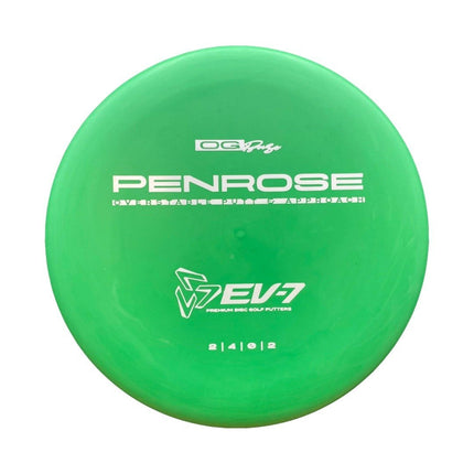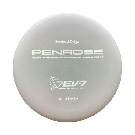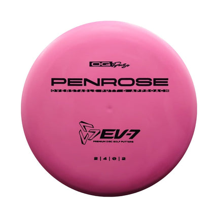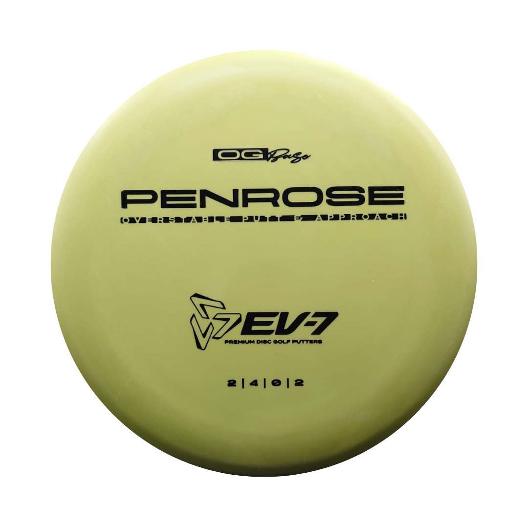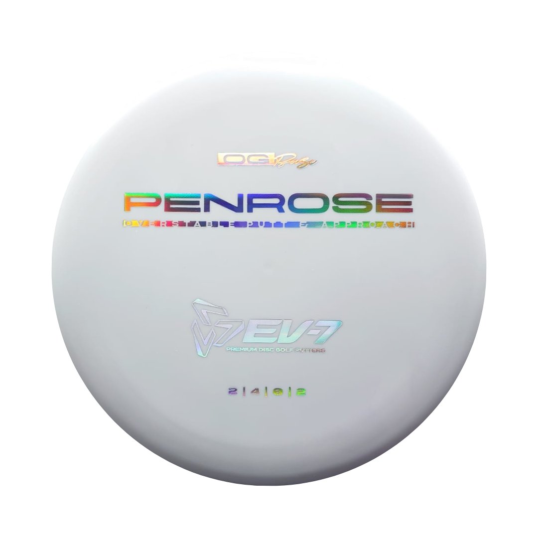 The Penrose is EV-7's debut putt and approach disc. It has reliable high-speed over stability and resistance to turn, but is uniquely straight with consistent fade at lower speeds on the putting green. With a slightly deeper profile, small bead, and smooth feel, the Penrose fits the hand comfortably, inspiring confidence for both putts and upshots.