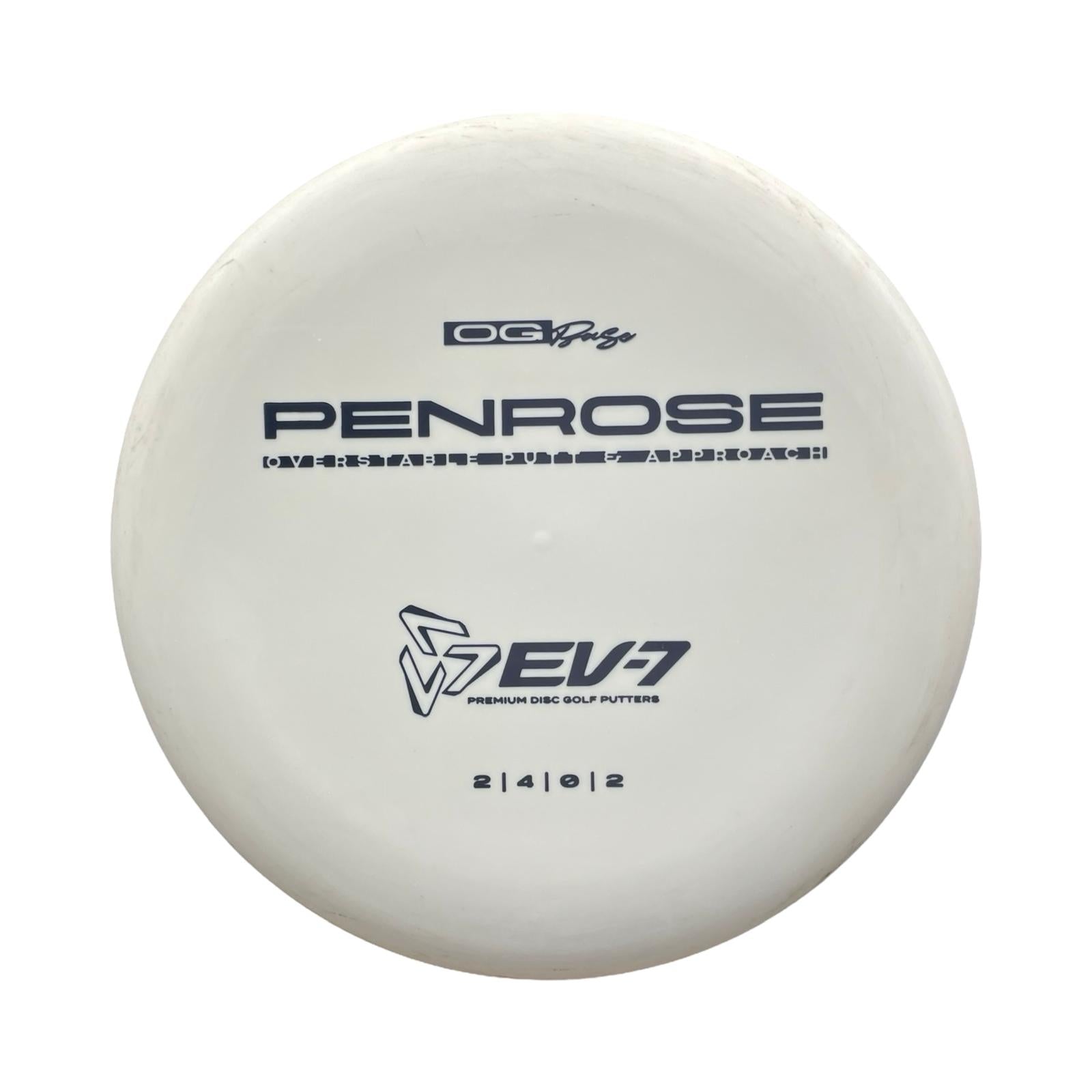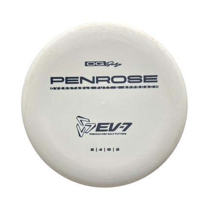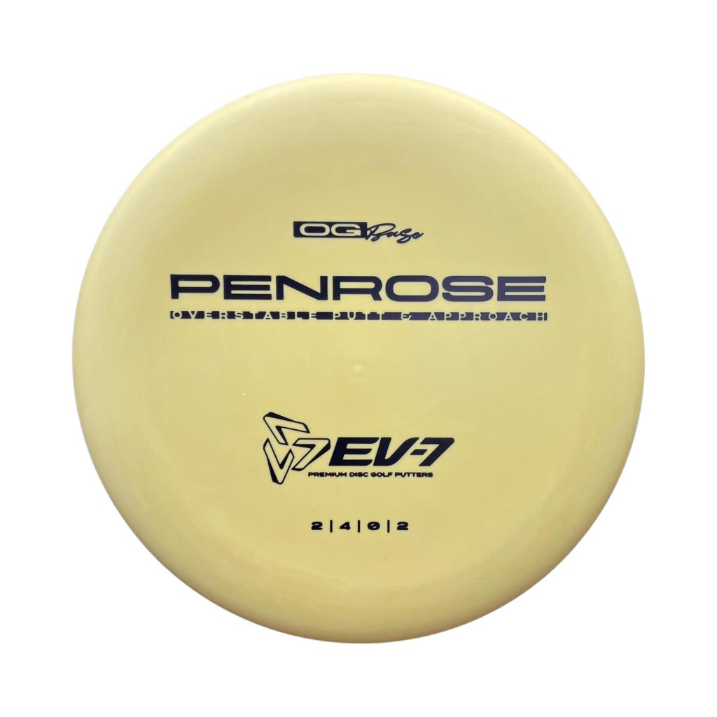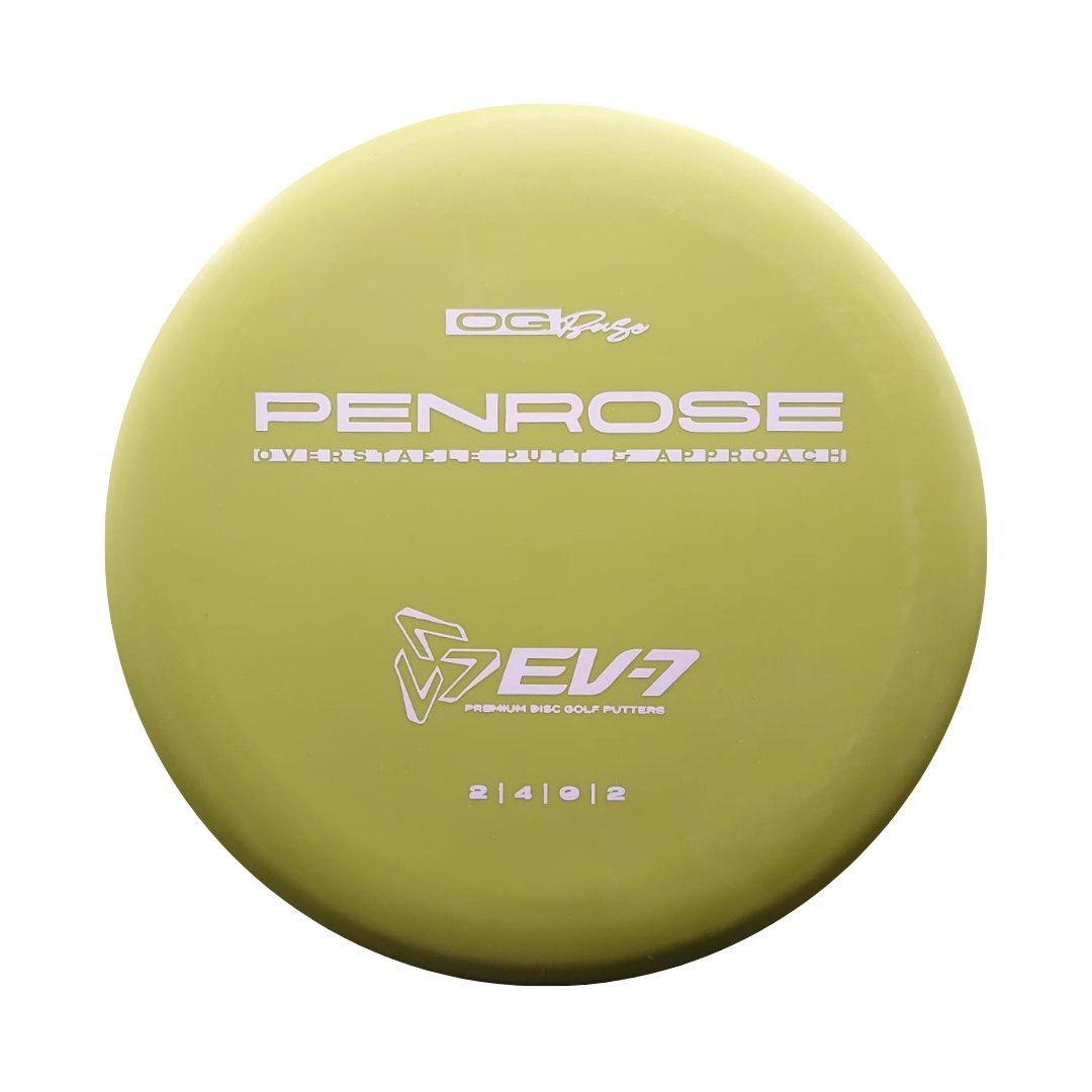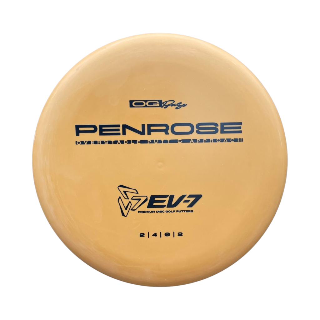 The Penrose is EV-7's debut putt and approach disc. It has reliable high-speed over stability and resistance to turn, but is uniquely straight with consistent fade at lower speeds on the putting green. With a slightly deeper profile, small bead, and smooth feel, the Penrose fits the hand comfortably, inspiring confidence for both putts and upshots.