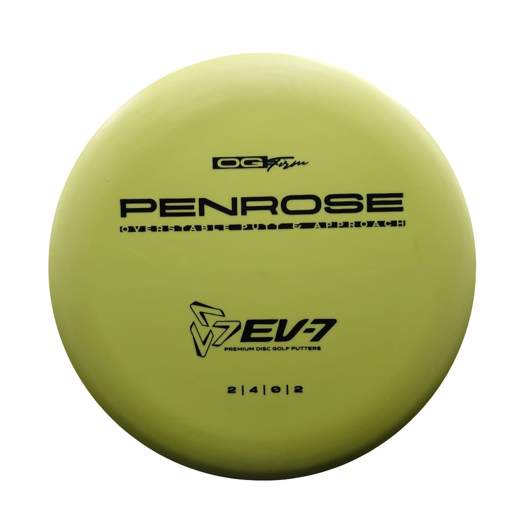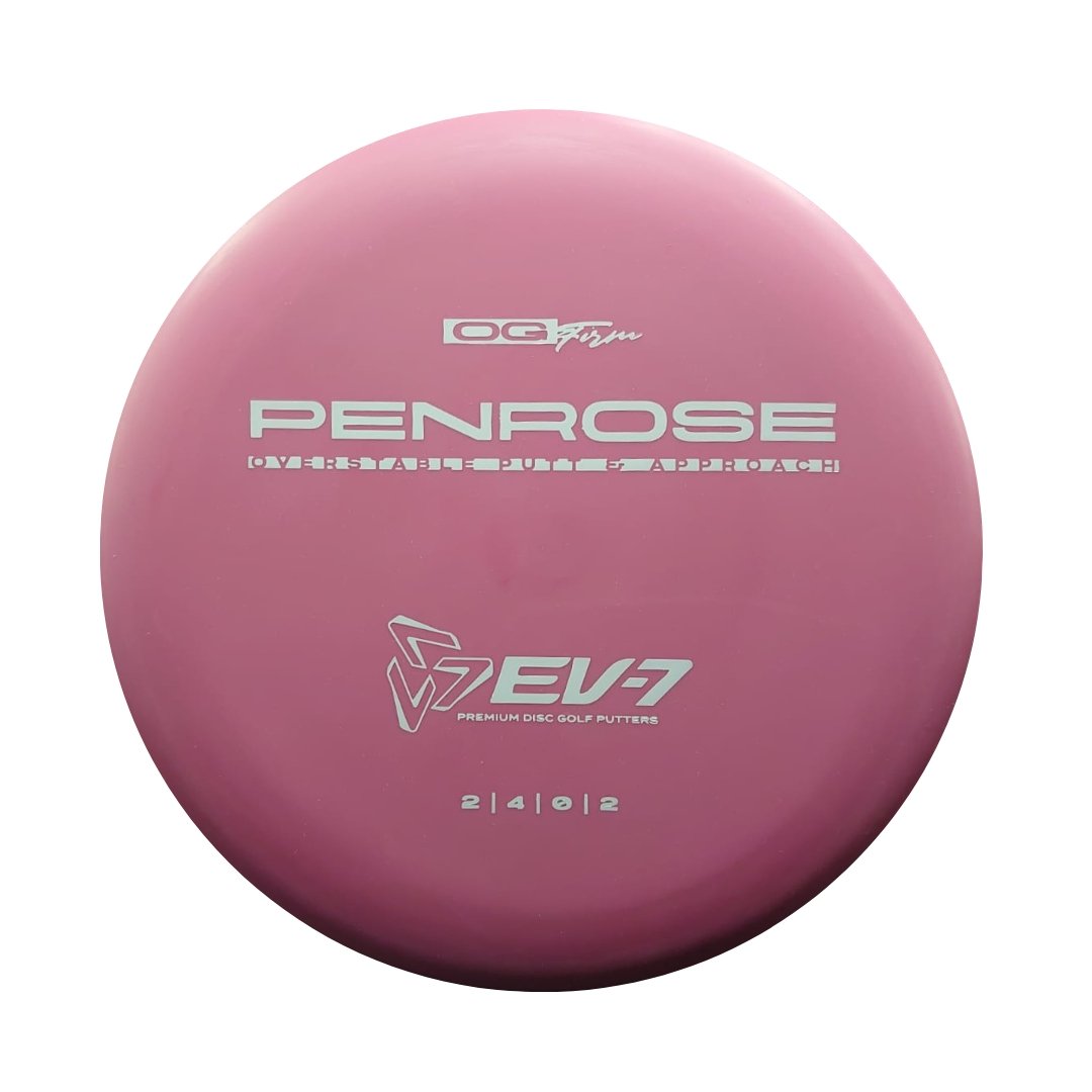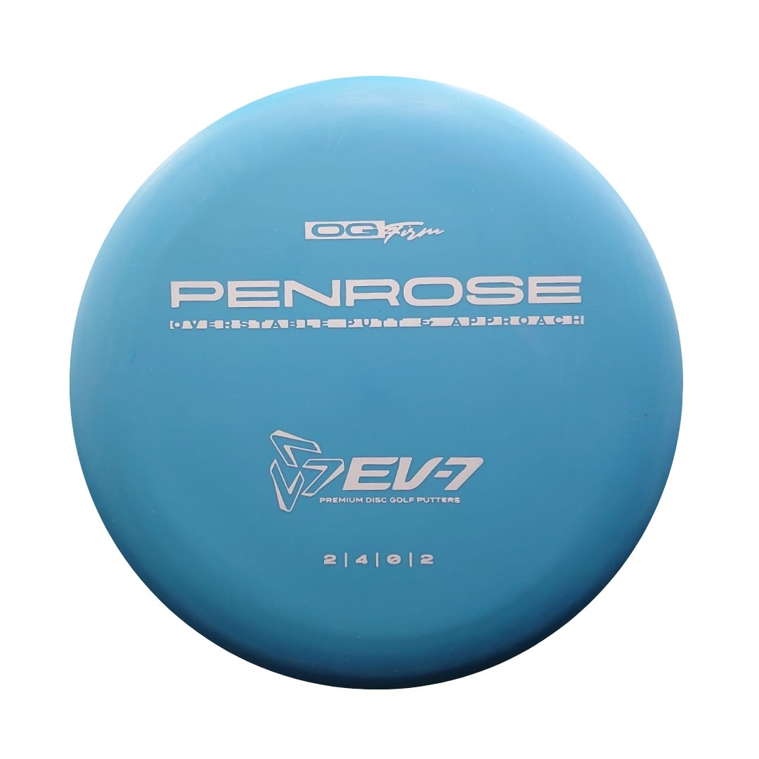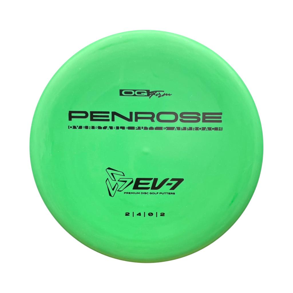The Penrose is EV-7's debut putt and approach disc. It has reliable high-speed over stability and resistance to turn, but is uniquely straight with consistent fade at lower speeds on the putting green. With a slightly deeper profile, small bead, and smooth feel, the Penrose fits the hand comfortably, inspiring confidence for both putts and upshots.